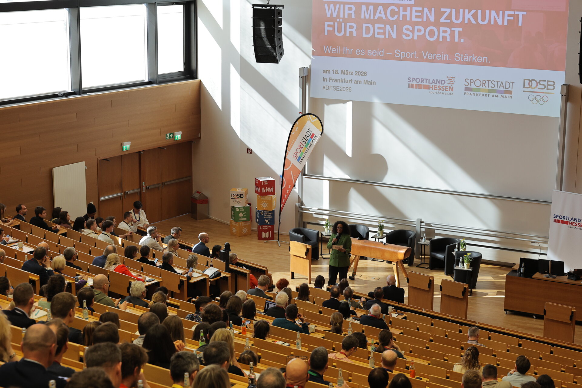 Ein voller Hörsaal, konzentrierte Diskussionen und spürbare Aufbruchstimmung: Auf dem Dialogforum Sportentwicklung kamen am 18. März im Campus Westend der Frankfurter Goethe-Uni knapp 500 Menschen aus Vereinen, Verbänden und Politik zusammen, um die Zukunft des organisierten Sports nicht nur zu diskutieren, sondern gemeinsam weiterzudenken. Unter dem Motto „Weil ihr es seid - Sport. Verein. Stärken.“ wurde sehr greifbar, wie groß der Wille ist, Verantwortung zu übernehmen, Perspektiven zu weiten und Veränderung aktiv zu gestalten. Die Breite der Themen - von barrierefreien Sportstätten über Ehrenamt, Physical Literacy und Vielfalt bis zur Zielstruktur 2035 und zum Breitensport der Zukunft - hat gezeigt, wie umfassend Sportentwicklung heute verstanden werden muss.